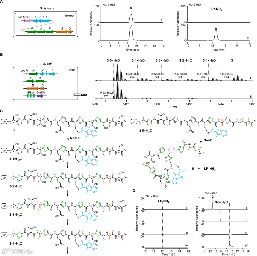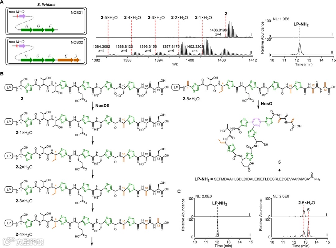 首先,该研究团队通过链霉菌体系的异源表达,只表达前体肽NosM与硫肽共有的后修饰酶,可以检测到5噻唑形成的中间体2发生不同程度脱水修饰的肽段,并发现了微量末端酰胺化的前导肽LP-NH2,暗示单环产物5的产生。后续的体外生化实验证明5脱水的中间体2-5×H2O确实可以转化为单环硫肽骨架(图2)。