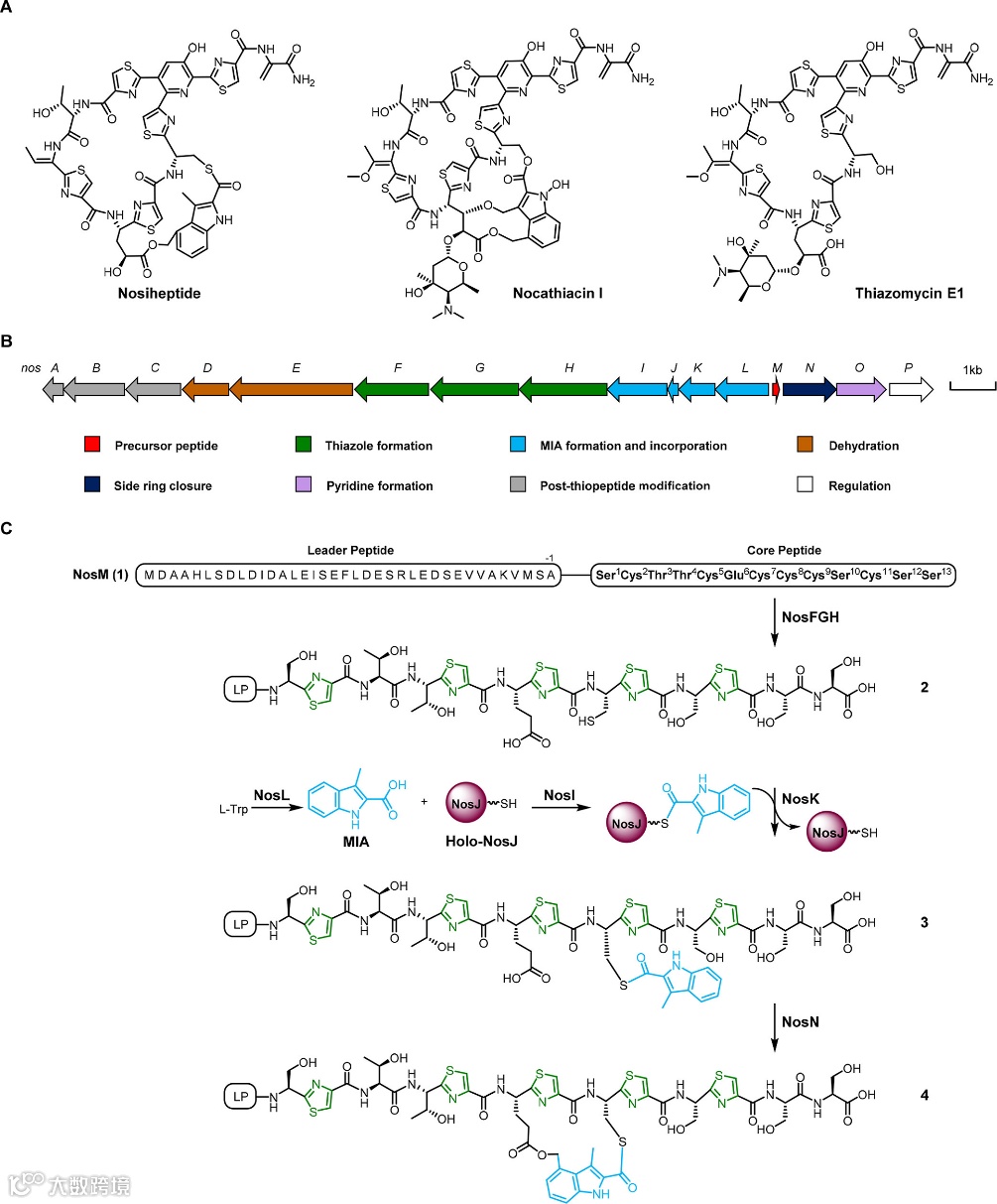 图1. 硫肽类天然产物及Nosiheptide有关的生物合成