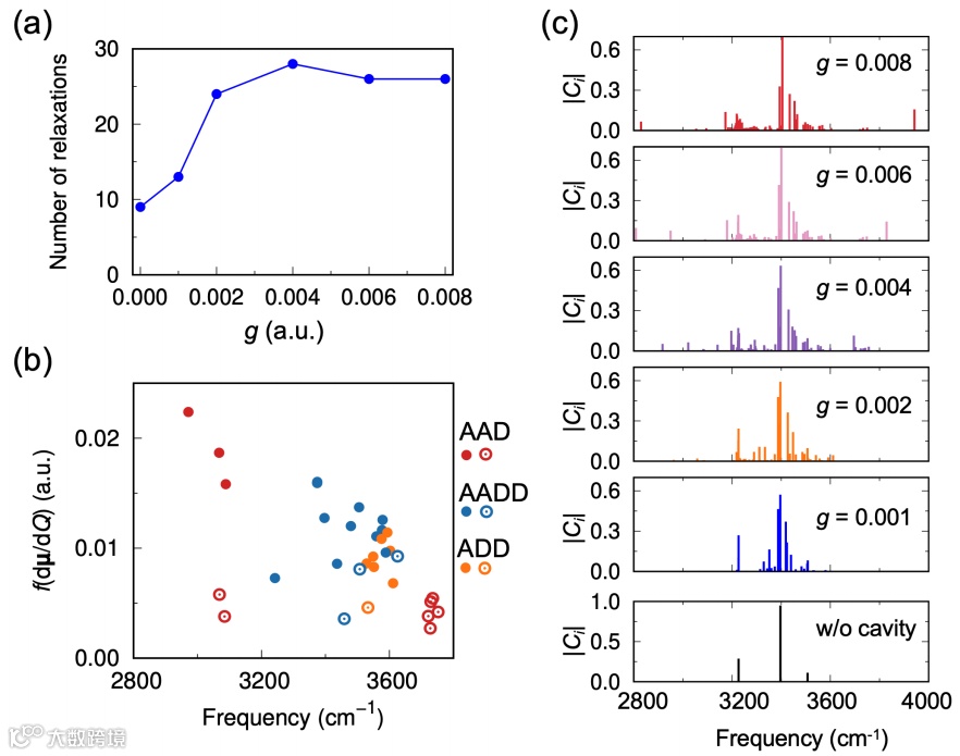 当(H2O)21水团簇在光学微腔中形成振动强耦合时,极化激元振动光谱成为了观测VSC效应的直接证据。图2展示了腔模频率为3400 cm-1时,(H2O)21-腔体系统在不同耦合强度下的振动光谱。随耦合强度g增大,OH伸缩振动谱(3000-3700 cm-1)快速分裂,且拉比裂分值呈单调递增趋势。VSC下的OH伸缩振动布居动力学显示(图2c),第一类OH伸缩振动可以在VSC下直接实现快速振动弛豫而无需分子间振动模式参与,第二类OH伸缩振动的动力学变化主要体现在弛豫速率的提升上。
