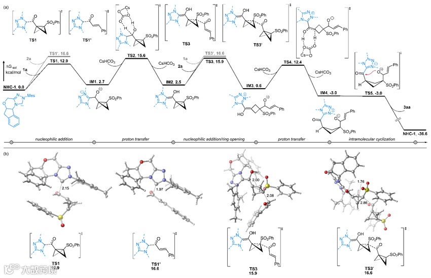 此外,为了深入研究该反应的机理,在天津大学黄跟平教授DFT计算研究的帮助下,作者提出了如图5所示的反应可能机理。计算结果表明,NHC催化剂优先与更缺电子的BCB醛基结合(TS1)(能垒降低3.7 kcal/mol),随后的协同C - C键断裂/亲核加成过程(TS3)通过显著降低空间位阻(键长缩短0.78 Å)进一步确保了反应的高选择性。该机理表明反应的选择性受到电子效应和空间效应的双重调控,且协同反应路径在动力学上更具优势。