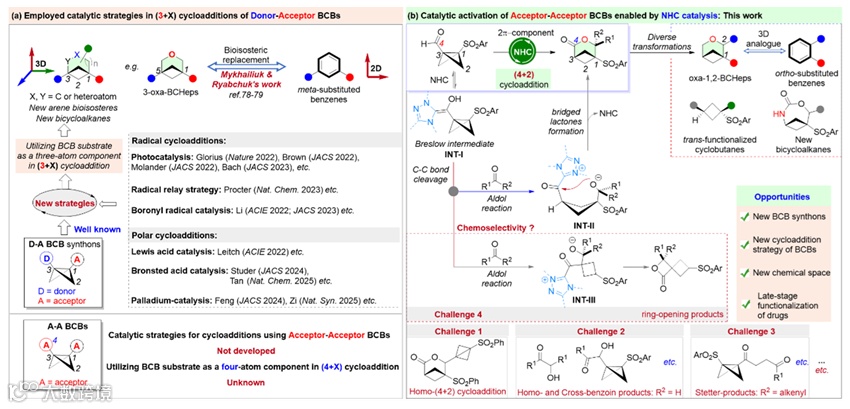在现代药物化学领域,双环[1.1.0]丁烷(BCBs)凭借其独特的三维结构和环张力特性,已成为构建具有药物研发价值的环丁烷衍生物和双环[n.1.1]烷烃类化合物的重要合成子。近年来,在“逃离平面”药物设计理念的推动下,利用三维的双环[n.1.1]桥环衍生物等排置换二维平面的芳烃备受药物化学家们的青睐,这促使利用BCBs环加成反应制备双环[n.1.1]烷烃衍生物成为有机合成化学的热点。近年来,在Glorius、Leitch、Studer、德国科学院院士Thorsten Bach、周其林院士、游书力院士、李鹏飞、江智勇、谭斌、邓力、陆平、资伟伟、王洪根、周岭、郑军、林进顺、李孝训、石磊、邓卫平以及冯见君教授、诺贝尔化学奖得主Benjamin List等国内外学者的创新性研究下,已开发出光催化、自由基接力催化、硼自由基催化、钯催化以及路易斯/布朗斯特酸催化等多种活化策略(图1a),成功实现了双环[n.1.1]烷烃的高效构建。这些方法的出现,为BCBs环加成反应搭建了桥梁,极大地丰富了其催化体系。然而,现有的研究大多聚焦于使用桥头位置含有单一吸电子基团的供体-受体型BCBs(D-A-BCBs),且这些BCBs均作为三原子组分参与(3 + X)环加成反应,作为对D-A-BCBs化学的补充,受体-受体型BCBs(A-A-BCBs)的环加成化学仍缺乏系统性研究。因此,开发相应的催化体系探索A-A-BCBs的反应潜力对于快速、多样化扩展小分子库至关重要,这将为现代药物化学发展带来深远影响。