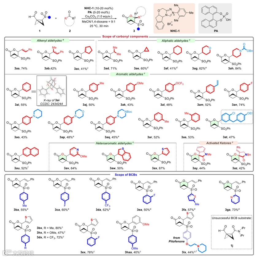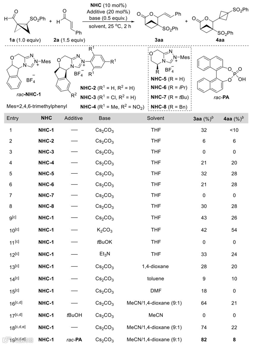 基于上述设想,作者以BCB醛和肉桂醛为模版底物,系统考察了NHC催化剂、添加剂,碱及溶剂等关键参数对反应选择性的影响并获得了最优条件(图2):使用NHC-1催化剂、Cs2CO3作为碱、乙腈和1,4-二氧六环为溶剂,在室温下反应30分钟,可获得最佳结果。值得注意的是,联萘酚磷酸酯(PA)的添加使3aa产率略有提升(条目19),作者推测PA可能通过与底物或中间体形成氢键相互作用,从而促进质子转移过程。