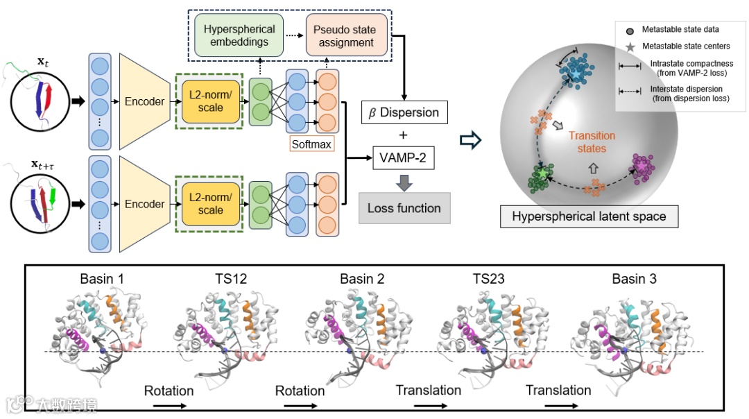 VAMP 2损失函数:该损失函数基于马尔可夫过程变分原理(Variational Approach for Markov Processes),用于提取系统中最慢的动力学模式。通过优化 VAMP‑2 损失,模型能够自动生成伪标签以区分不同亚稳态,在超球面潜空间中重建反映原始构象变化的动力学连接关系,并将来自同一亚稳态的样本在潜空间中紧密聚集,从而清晰区分不同动力学簇。