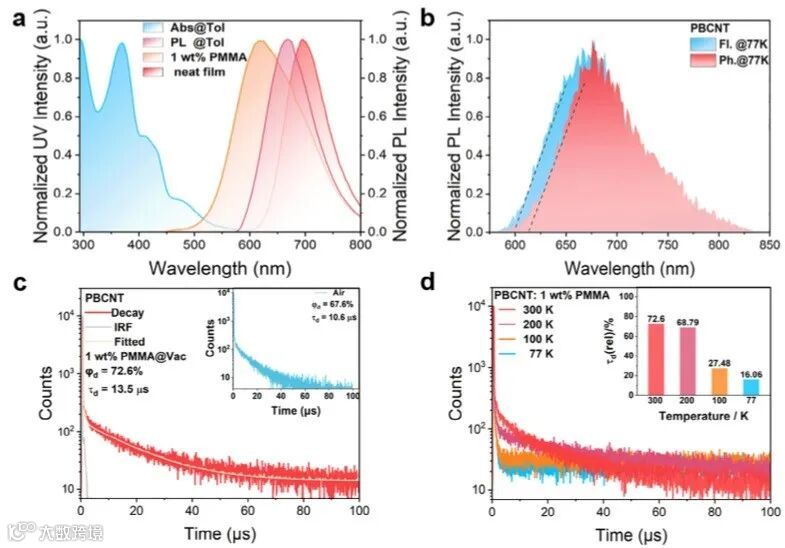 Figure 2. Photophysical properties of the PBCNT emitter. a) Normalized UV/Vis absorption and fluorescence spectra in diluted toluene solutions (1 × 10−5 m) at room temperature, excited at 490 nm; normalized fluorescence spectra in PMMA-doped films (1 wt.%) and neat film at room temperature. b) Normalized fluorescence and phosphorescence spectra in diluted toluene solutions (1 × 10−5 m) at 77 K, excited at 490 nm. c) Transient PL decay profile of the 1 wt.% PBCNT emitter-doped thin film in PMMA, measured at 300 K in vacuum (Inset: transient PL decay profile under air, 𝜆ex = 450 nm. d) Temperature-dependent transient PL decay spectra of the 1 wt.% PBCNT emitter-doped thin film in PMMA (𝜆ex = 365 nm); the inset shows the delay component change and temperature dependence of 𝜏d (rel) for the 1 wt.% PBCNT emitter-doped thin film in PMMA.