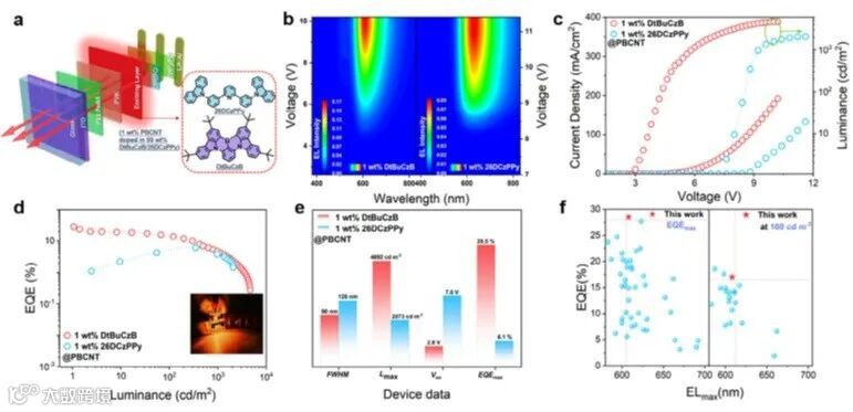 Figure 3. Device structure and performance of the PBCNT:26DCzPPy/DtBuCzB -based OLEDs. a) Device structure. b) Electroluminescence spectra of PBCNT devices with 26DCzPPy and DtBuCzB hosts at different applied voltages. c) Current density–voltage–luminance (J–V–L) characteristics of 1 wt.% PBCNT:26DCzPPy/DtBuCzB emitter-based solution-processed TADF-OLEDs. d) EQE–luminance characteristics (Inset: actual luminescence image of the 1 wt.% PBCNT: DtBuCzB-basedOLED). e) Device data summary. f) Comparative summary of EQE (EQEmax and EQE at 100 cdm−2) of representative solution-processed red TADF OLEDs with maximum emission peaks in the 580–700 nm range.