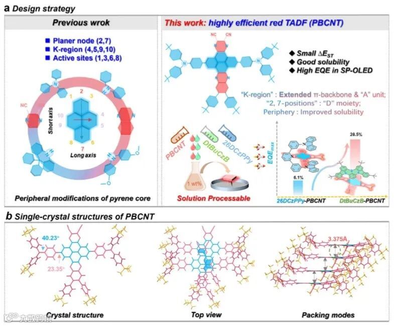 Figure 1. a) Molecular design strategy of the PBCNT TADF emitter. b) Single-crystal structure analysis of PBCNT.