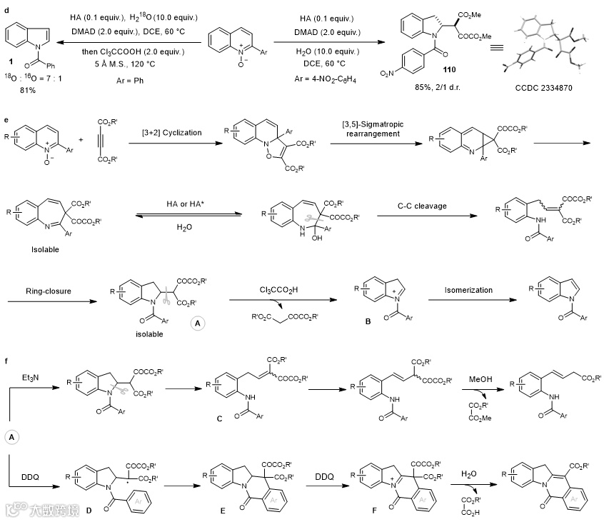 在机理研究过程中,作者使用了 H218O作为示踪剂,有力地证明了水是以分子间作用的方式参与到反应之中(图6)。在反应中,首先通过喹啉N-氧化物与二烷基乙炔二羧酸酯的[3+2]环化/[3,5]-σ重排/环扩张级联反应生成苯并氮杂䓬中间体。随后,苯并氮杂䓬与水在布朗斯特斯酸催化下发生半缩醛化/逆Mannich/aza-Michael加成反应,生成2-取代吲哚啉。进一步的反应步骤包括通过三氯乙酸促进的离去反应生成吲哚,通过三乙胺促进的环开裂生成2-烯基苯胺,以及通过DDQ促进的自由基环化生成异喹啉酮。