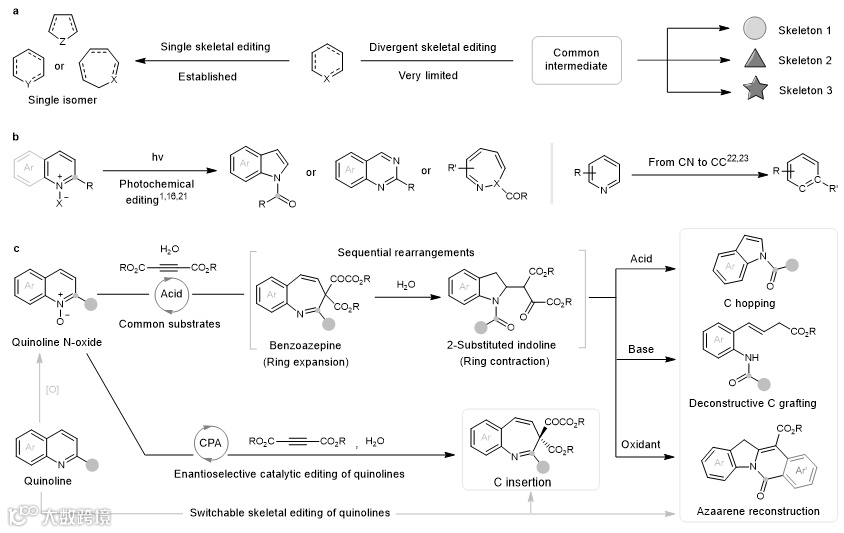 在药物研发领域,喹啉及其衍生物是许多抗疟疾、抗癌药物的核心结构。然而,传统化学修饰通常仅能针对喹啉的侧链或官能团进行局部改造,若要直接“裁剪”或“重组”其骨架结构,往往需要多步繁琐反应,且难以灵活控制产物的多样性。如何通过简单方法实现喹啉骨架的可切换、高选择性编辑,一直是化学家面临的挑战。当前,虽有方法可通过选择性插入、删除或转化原子提升分子核心结构多样性,但常需依赖不同独立策略及特定底物修饰产物核心,限制了在结构-活性关系研究中的广泛应用。