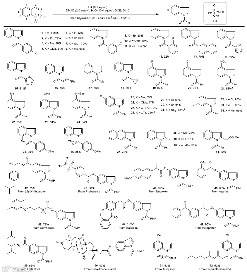 首先,作者以2-苯基喹啉氮氧化合物和丁炔酸二甲酯作为模板底物,通过一系列条件筛选,作者发现Brønsted 酸对中间体 2-取代吲哚啉的生成至关重要。当使用二苯基磷酸作为催化剂时,于1,2-二氯乙烷(DCE)中,在 60 °C的温度下反应 12 小时,以89%收率生成2-取代吲哚啉。随后研究表示,在一锅法中添加三氯乙酸,高效脱去2-取代吲哚啉的侧链,可生成N-酰化吲哚。在得到最优的反应条件后,作者对此转化的底物兼容性进行了考察(图2)。结果显示喹啉2-位上不同官能团化(如苯基、杂芳基、烯基、烷基等)的底物均能实现这一转化,以良好的产率得到所需的N-酰基吲哚(1-18)。同时,喹啉氮氧化合物3位及5位至8位的缺电子取代基(F、Cl、Br、NO2)和富电子取代基(Me、OMe)都能很好地兼容,以优异的收率得到相应的产物。此外,这种转化还能够耐受多种药物化学中常见的官能团,例如氨基甲酸酯(NHBoc)(24)、三异丙基甲硅烷氧基(OTIPS)(27)、甲苯磺酰氧基(OTs)(28)。作者还展示了该方法在药物分子后期修饰中的应用潜力。通过简单的一步反应,该方法可以将解毒喹、替利喹诺、布洛芬、丙磺舒、萘普生、阿司匹林和吉非罗齐等药物衍生物中的喹啉骨架部分转化为相应的吲哚衍生物。这一方法不仅操作简单,而且对空气和水分不敏感,具有广泛的底物适用性和良好的官能团兼容性。