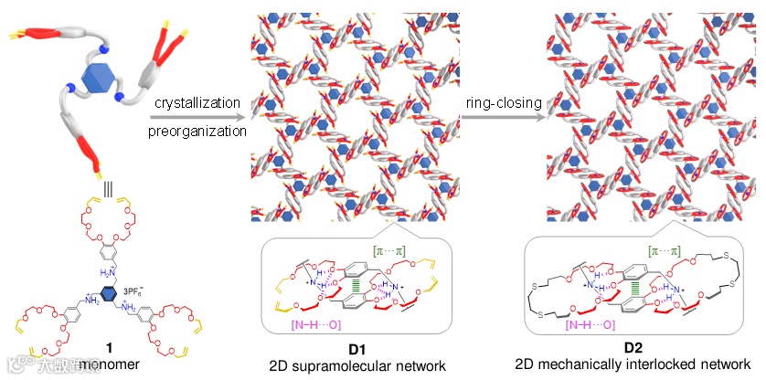 图1. 纯有机二维机械互锁蜂窝网络聚合物的构筑示意图