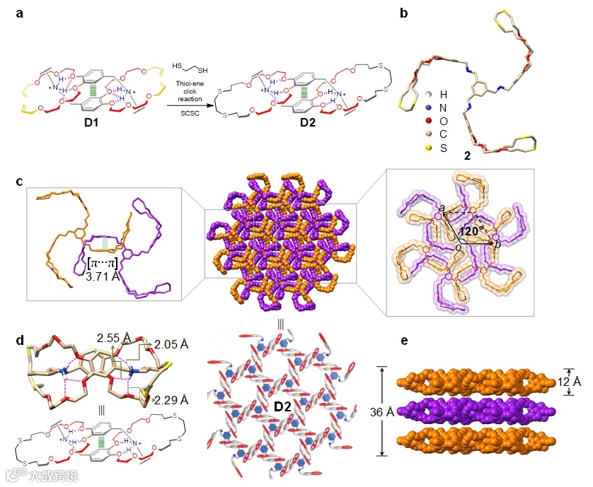 研究团队采用“结晶预组织-机械键后修饰”两步策略(也可形象地描述为“结晶引导-化学缝合”策略)解决了这一难题:首先通过超分子结晶驱动预组织获得伪[c2]雏菊链连接的二维超分子晶体D1,然后通过光引发的光诱导硫醇-烯点击反应,经单晶到单晶的转变完成机械互锁,从而得到具有[c2]雏菊链连接的晶态机械互锁网络D2(图1)。