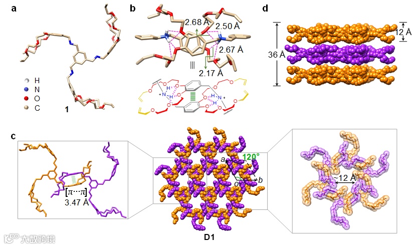 具体来说,研究团队设计了一种C3对称的三元单体1,其含有开链的寡聚冠醚链与二苄基二级铵盐单元,可借助多种互补的非共价作用(如氢键、π−π相互作用)在水的作用下自发地头尾相接。通过分级自组装单体1先形成二聚体,紧接着是六聚体,最后构成晶态准[c2]雏菊链的二维网络D1。然而,由于柔性寡聚冠醚链的存在,其晶体结构无序严重,结构测定面临诸多困难。该团队通过坚持不懈的努力,优化晶体的质量以及同步辐射X射线源的应用,最终成功解析了D1的超结构,揭示了其六边形蜂窝网络层状结构特征(图3)。扫描电子显微镜图像显示晶体D1呈规则的六棱柱形貌(图2),该团队推测由于二苄基二级铵盐的两侧布满六氟磷酸根阴离子,蜂窝网络在静电、疏水相互作用下发生层层堆叠现象,最终形成六棱柱晶体。