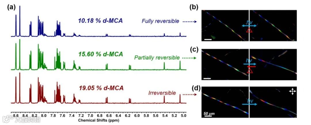 在多次动态解扭和扭曲循环运动过程中,螺旋纤维的结晶性和整体螺旋形态可得到很好地保留,从而允许多次往复循环运动。在间歇性光激发和连续加热下,MCA结晶纤维可以在5小时里进行高达200次以上的周期性解扭和扭曲运动。进一步研究表明,光二聚体(d-MCA)的含量显著影响光响应,导致不同二聚体含量下的纤维完全可逆循环、部分反向解扭或完全解扭(图2)。此外,研究人员还发现只需形成大约10%的d-MCA就足以驱动螺旋纤维进行持续循环运动。该研究结果为制造基于螺旋扭曲运动的新型动态有机晶体提供了新的范例,并有望应用于未来软体机器人和光致动器等智能体系的开发与构筑。