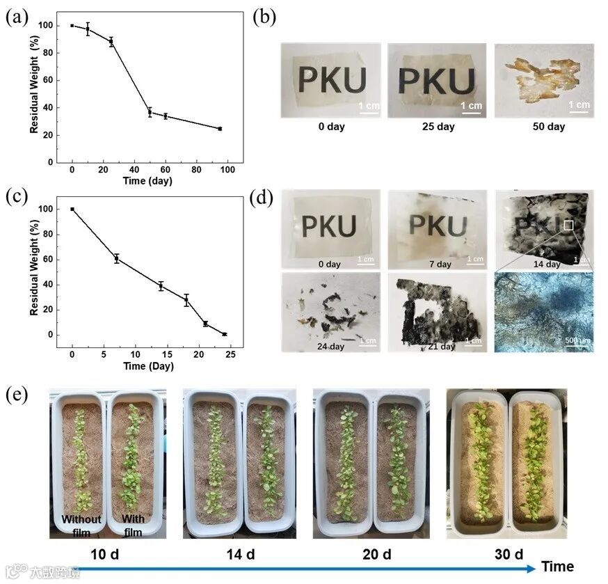 SA-DTAB-Ca塑料的优势不仅体现在力学性能上,其降解产物对土壤和植物生长也具有明显的促进作用。研究人员进行了一系列实验,在种植小白菜的沙子中分别设置埋入SA-DTAB-Ca塑料的实验组和不埋入该塑料的对照组。实验数据表明,对于埋有SA-DTAB-Ca塑料的实验组,小白菜的鲜重增加了 40%,干重增加了 12%,且植株生长态势明显优于对照组。同时,在实验初期,实验组的沙子保水能力比对照组高出 30% 以上,在后续几天更是高出 100% 以上。这意味着,SA-DTAB-Ca塑料的降解产物不仅能为植物生长提供丰富的养分,还能显著改善土壤的保水性能,为植物创造更有利的生长环境。其中,SA是一种常用的肥料成分,DTAB是一种可降解为NH3和CO2的洗涤剂,而Ca2+是可生物吸收的,因此这种塑料不会对土壤造成长期危害。
