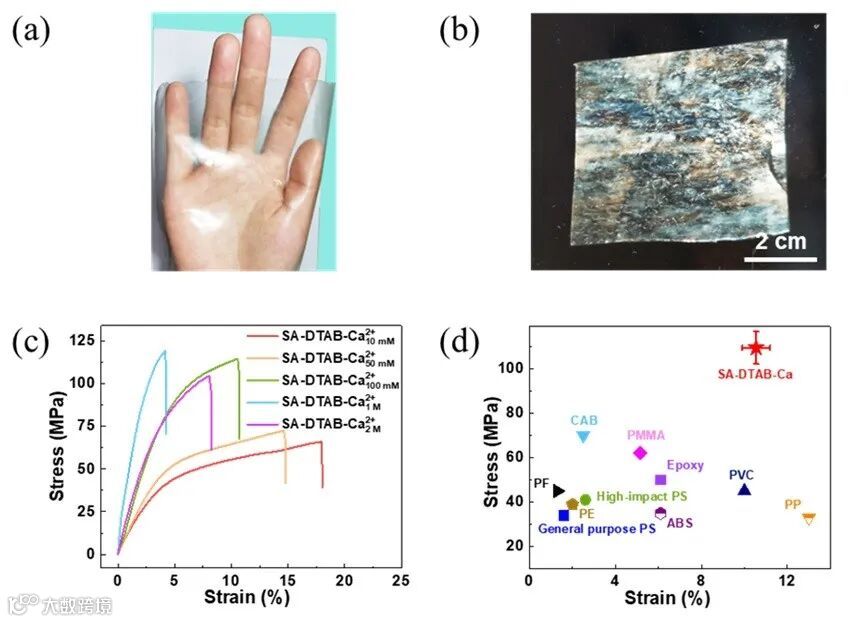 基于这一思路,研究团队首先利用海藻酸钠(一种常用于促进植物生长的生物多糖,SA)和阳离子表面活性剂十二烷基三甲基溴化铵(DTAB)作为组装基元,通过固相分子组装策略(SPMSA)制得了SA-DTAB超分子薄膜。随后利用钙离子配位,得到了兼具高力学性能和良好生物降解性的SA-DTAB-Ca超分子塑料。与传统浇铸成膜法不同,SPMSA策略通过温和压力促进介观畴区的重排与融合,在常温常压下即可得到宏观尺度的透明超分子塑料。