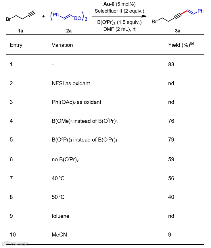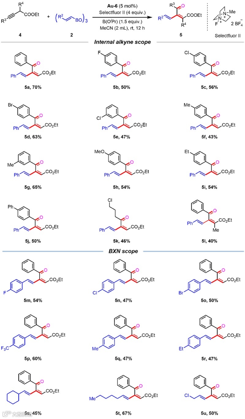 在已有的反应条件基础上,作者对反应条件展开进一步研究(表1)。首先该反应对氧化条件有着明确要求,其中选择性氟试剂(Selectfluor II)效果最好。在添加剂方面,三异丙基硼酸酯相较于同类物能够显著提高反应产率。在反应温度方面,升高温度会导致反应产率下降。此外该反应也在多种常用的溶剂环境中被考察。结果表明,端炔底物更倾向于在DMF中反应,而内炔底物倾向于在MeCN中反应。