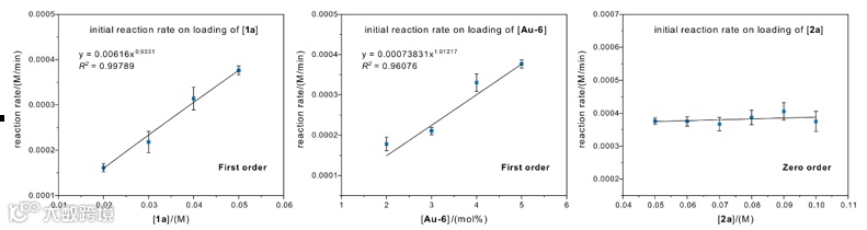 为进一步认识氮膦配体修饰的双核金表现出的优异催化效能,作者开展了动力学研究(图5)。动力学实验进一步表明双核金催化剂和炔烃对反应呈现出一级动力学效应,而烯基硼试剂与反应的决速步无关。通过以上实验结论,作者推测双核金与炔烃底物之间特殊的相互作用关系是反应的关键要素。
