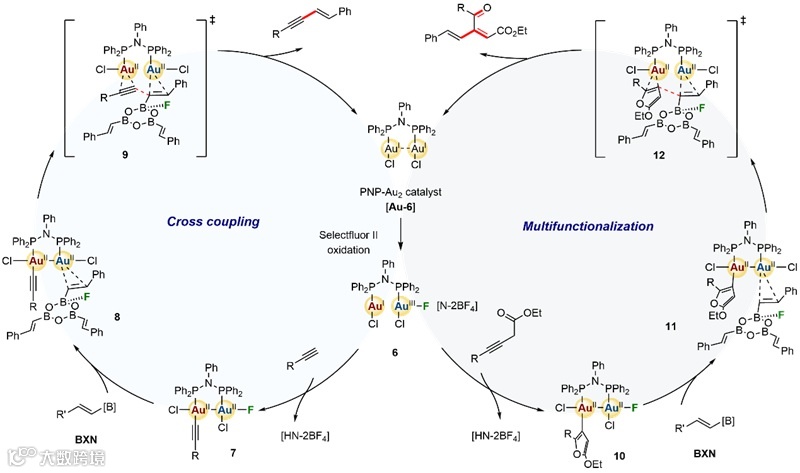 基于实验结果和理论计算,作者根据产物结构特点将以上工作分为交叉偶联和多官能团化两个部分,并提出相似的催化循环机制(图11)。以交叉偶联反应为例,在Selectfluor II的作用下,双核金被氧化至高价状态6,并通过远离氟的金原子与体系中的端炔底物结合。接着体系中的碱性氮骨架对端炔发起拔氢,生成炔基金物种7。之后烯基硼试剂与炔基金物种迅速发生无势垒的F-B成键,并通过金的亲π特性实现对烯基模块的捕获(8)。最后两个金原子分别活化的炔基与烯基骨架以协同1,2—还原消除的形式(9)得到最终的烯炔结构,并伴随催化剂的再循环。