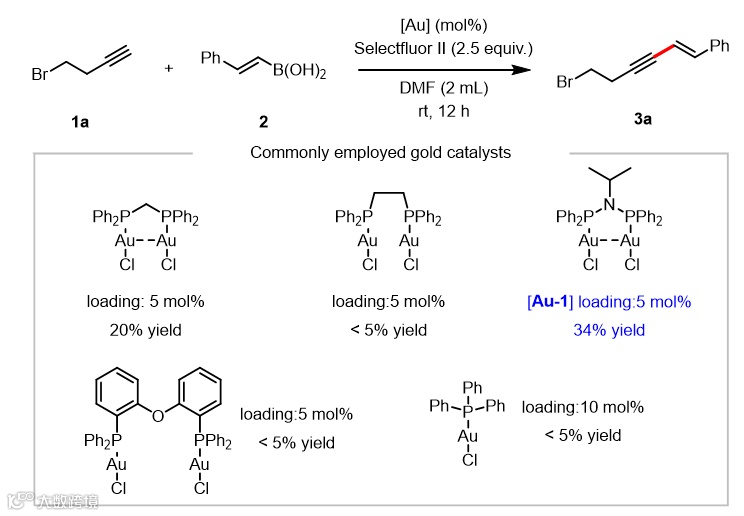作者首先选择4-溴-1-丁炔(1a)和苯乙烯基硼酸(2)为底物,Selectfluor II为氧化剂,DMF为溶剂,在室温条件下考察了几种常见的均相金催化剂(图2)。实验结果表明,常见的单核金催化剂无法驱动交叉偶联反应。相较于金原子中心相距较远的双核金催化,原子中心更近的金催化剂则表现出显著的催化活性。其中氮膦配体修饰的双核金催化剂能够以34%的产率获得目标产物。在此基础上作者进一步制备了多种氮膦配体,并开展系统的催化活性考察。
