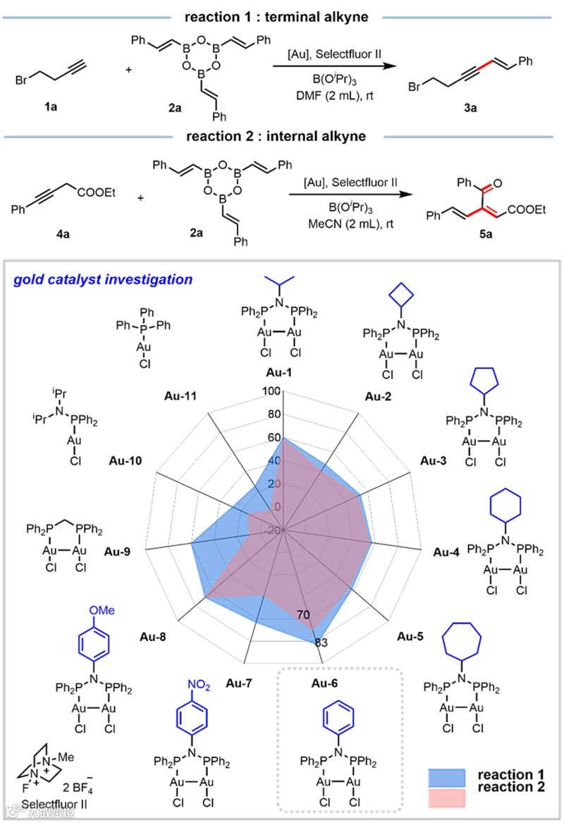 首先以N上取代基为研究对象,根据取代基的空间位阻和电子特性,作者检验了多种氮膦配体双核金的实际催化效果(图3)。实验结果表明各种烷基取代基修饰的氮膦配体双核金均能顺利驱动烯基硼与炔烃之间的转化,并以中等收率获得共轭烯炔和1,3—丁二烯产物(Au-1—Au-8)。其中苯基修饰的氮膦配体双核金催化剂,能够以最高83%和70%收率获得相应共轭烯炔和1,3—丁二烯产物(Au-6)。此外。作者也考察了几种常见的金催化剂,例如dppm配体修饰的双核金和膦配体修饰的单核金。这些催化剂表现出较低的催化效能,与氮膦配体修饰的双核金存在显著差异。