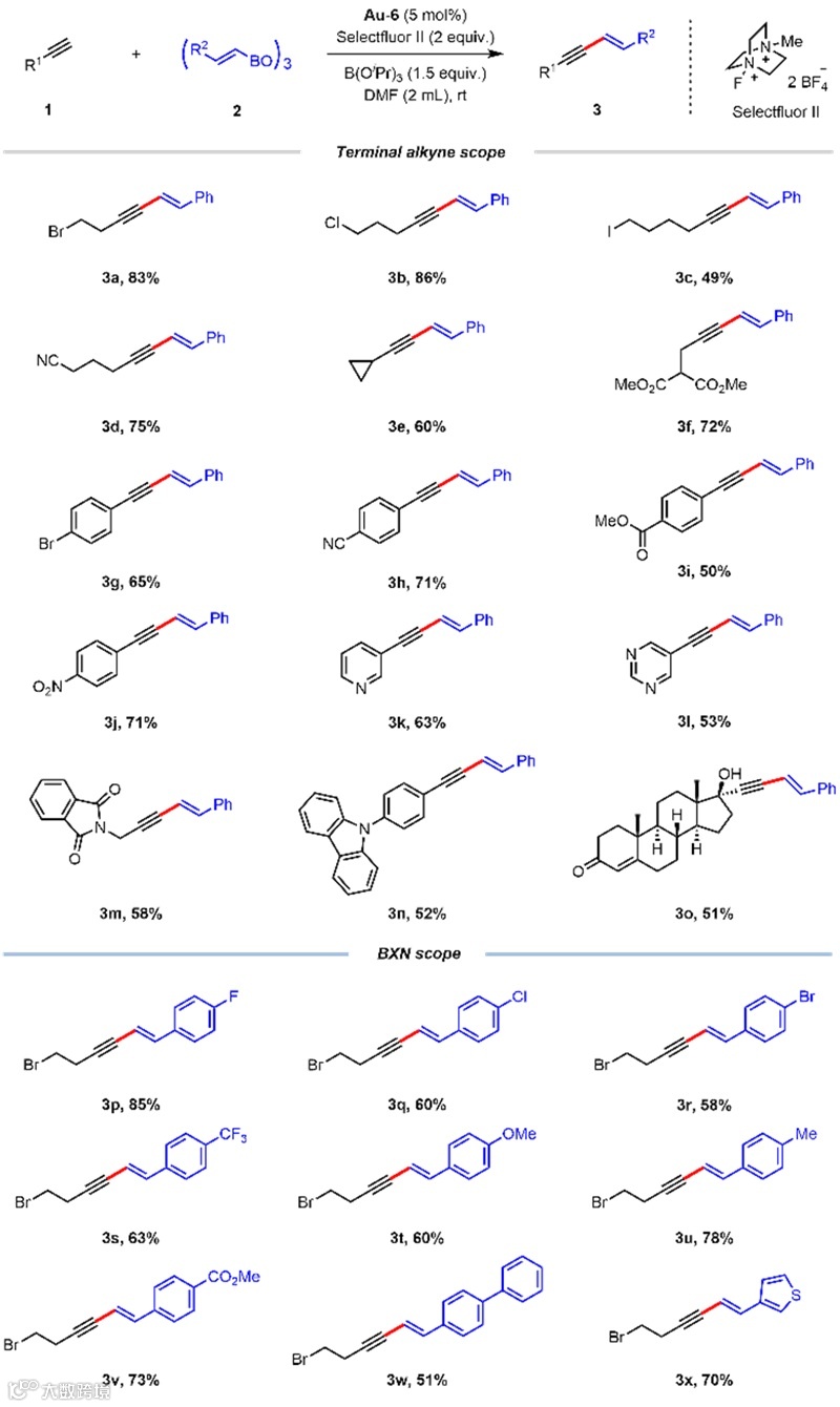 为进一步揭示反应机制,作者以端炔与烯基硼试剂的交叉偶联为研究对象,展开系统的理论计算(图6)。作者发现催化剂氧化和炔烃活化阶段计算出的能垒与实际的室温反应条件相吻合。其中炔烃的活化存在两种不同的可能性,即炔烃活化发生在连有氟原子的金上,以及远离氟原子的金上。值得注意的是这两种反应路径之间并存在显著差异。对此作者同时保留这两种反应路径,并以此为基础展开后续计算。