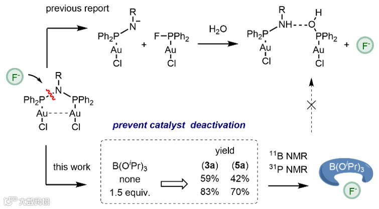 值得注意的是,本工作首次应用了一种抗双核金催化剂失活剂,克服了以往氮膦配体修饰的双核金在含氟环境中的结构不稳定问题。作者通过核磁硼谱和膦谱对抗失活剂的作用机制展开研究。结果表明,这种抗失活剂通过捕获体系中游离的氟离子,减缓了配体发生氟离子促进的氮膦键解离(图4)。