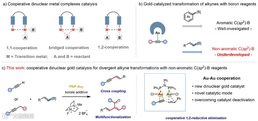 南京大学谢劲课题组通过配体微调控策略,成功创制系列新型双核金配合,实现变价金催化体系下的烯基硼试剂高效转化。该研究突破性构建多种新型共轭烯炔及1,3-丁二烯分子骨架,展现出优异的化学选择性与构象选择性控制能力。该团队通过引入金催化剂保护试剂,首次有效解决了氮膦配体双核金在含氟反应体系中的自分解难题。作者通过理论计算与机理实验系统解析了反应路径。结果表明,双核金催化剂对炔烃和烯基硼试剂的协同活化模式是反应高效进行的核心要素,并据此提出双金属协同1,2-还原消除新基元反应(图1)。相关成果近期发表在《德国应用化学》(Angew. Chem. Int. Ed.)上。南京大学博士生方尚文为该论文第一作者,谢劲教授、韩杰副研究员和赵劲教授与为该论文的共同通讯作者。