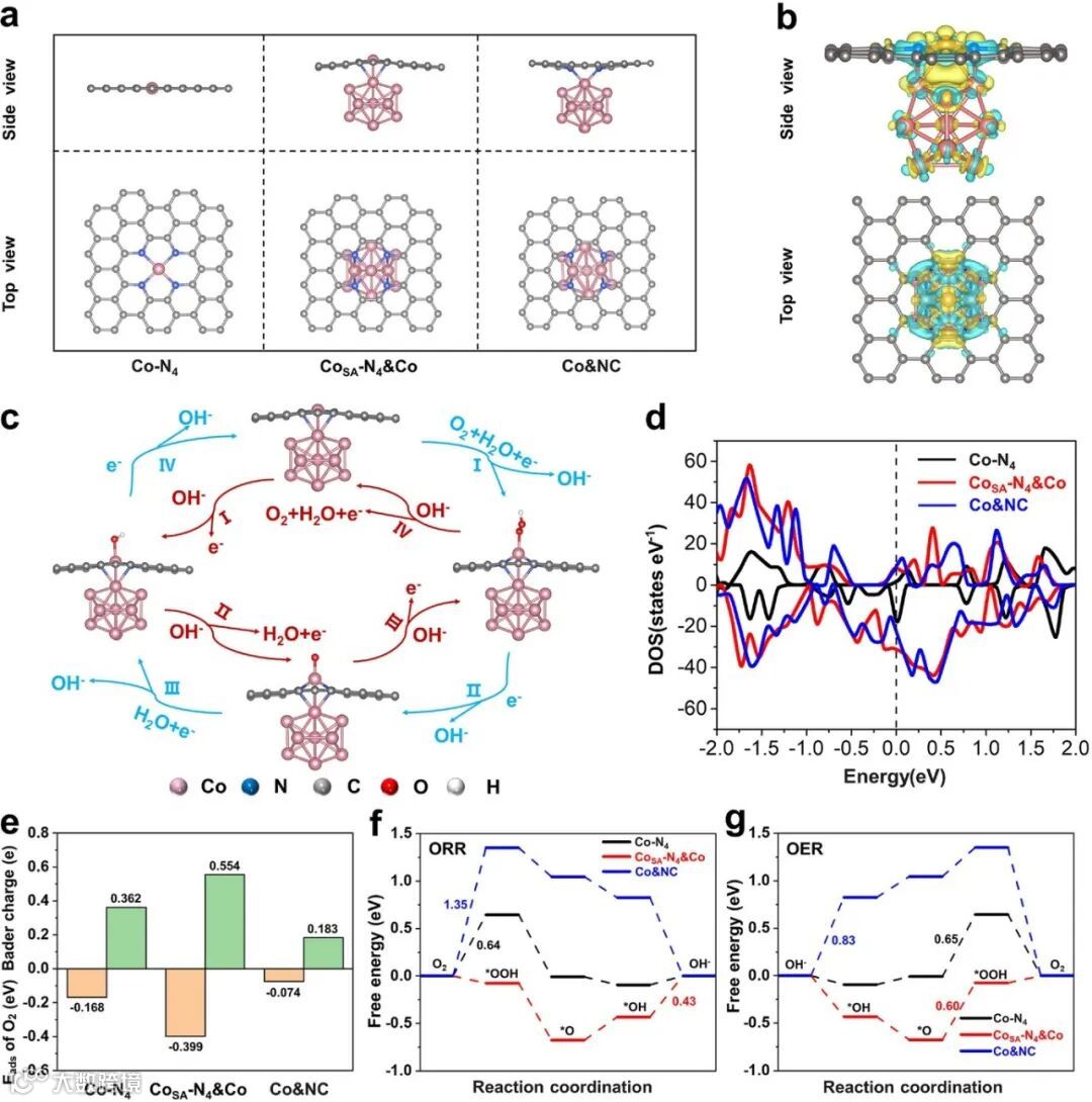 密度泛函理论(DFT)计算表明,在Co单原子与金属钴复合位点(CoSA-N4&Co)中,电子从Co纳米颗粒向单原子位点转移,这种优化的电子结构显著促进了催化反应。此外,其决速步能垒最低(ORR: 0.43 V,OER: 0.6 V),进一步证实该复合位点是催化反应的主要活性中心。