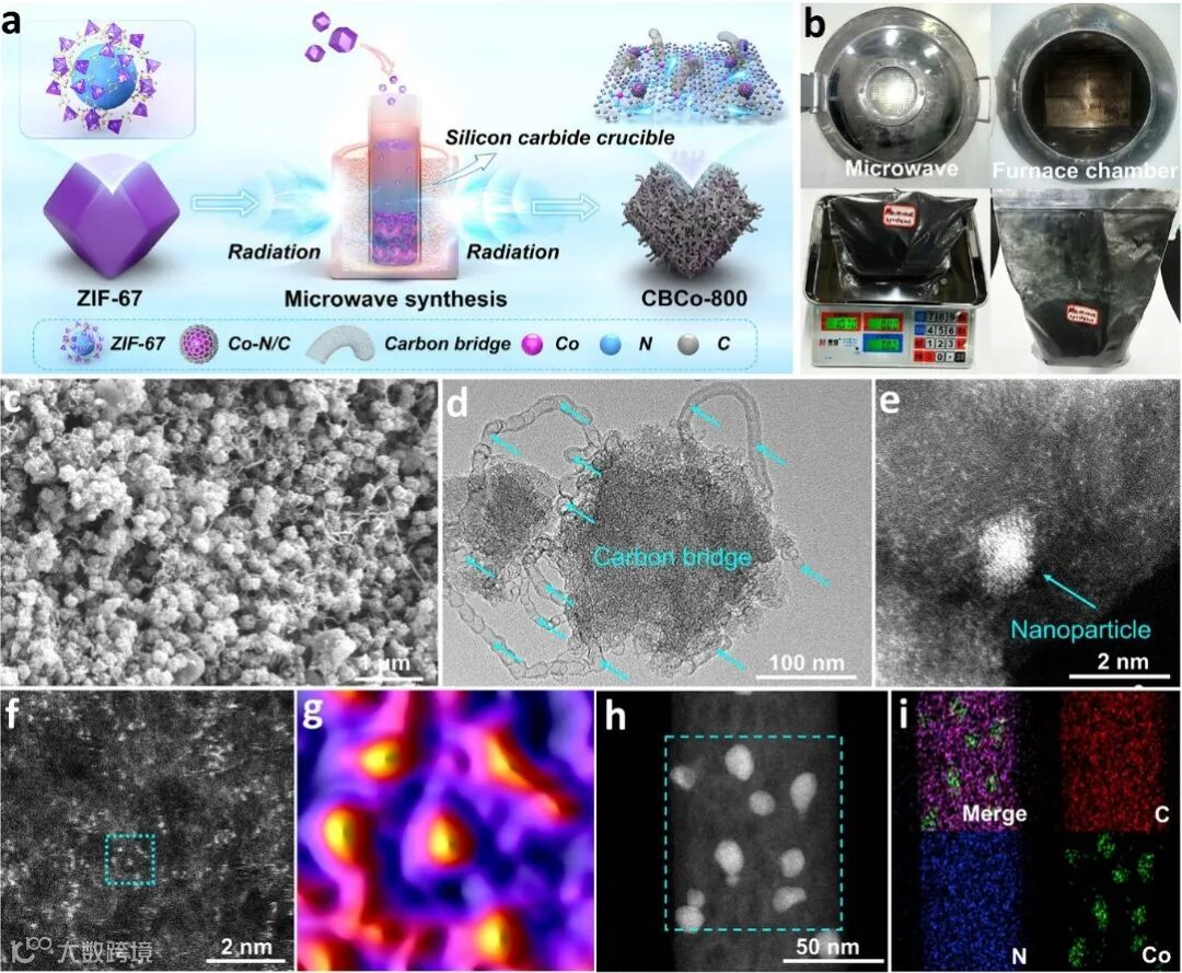 A:如上所述,我们的研究兴趣是研究金属有机骨架材料的制备及其电催化的应用。众所周知,电催化过程中氧化还原反应(ORR/OER)是关键的电化学过程,但高效ORR/OER电催化剂的快速大规模生产仍然具有挑战性。我们的目标很简单,就是采用微波辅助热解ZIF-67策略,在自主设计的微波-SiC系统构建了具有纳米碳桥结构的钴基催化剂(CBCos)。该技术的核心在于构建了"纳米碳桥"管状网络,通过锚定钴颗粒和单原子的功能化碳基体("桥墩")与碳纳米管("桥身")的协同作用,实现了钴物种与碳基体之间的结构和电子耦合。这为实现活性位点可控构建和高性能电催化剂制备提供了新思路。