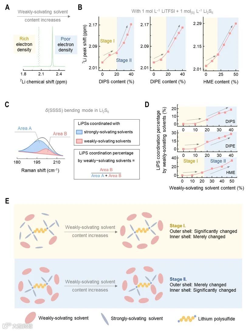 为了解析LiPSs的溶剂化结构,本工作从Li原子端和S原子端分别进行谱学表征(如图5所示)。在Li原子端,7Li核磁结果呈现双阶段变化,表明弱溶剂在第一阶段未参与LiPSs配位,而第二阶段参与了LiPSs配位。在S原子端,对SSSS链段弯曲振动的拉曼位移进行表征,结果表明上述振动模式可解耦为强溶剂配位和弱溶剂配位两部分,在弱溶剂含量低于10%时不发生配位,而弱溶剂含量在40%时的配位比例达到20%以上。综合谱学结果,在弱溶剂含量较低时(阶段一)弱溶剂主要存在于LiPSs的第二溶剂化壳层,而弱溶剂比例较高时(阶段二)弱溶剂进入第一溶剂化壳层并直接和LiPSs配位。上述溶剂化结构的双阶段变化行为和电化学极化的变化趋势吻合,这暗示着弱溶剂对LiPSs的直接配位是导致LiPSs电荷转移迟滞的原因。