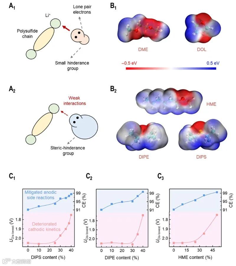 LiPSs的溶剂化是通过溶剂的配位作用实现的,因而在溶剂中的配位原子附近接枝大位阻官能团可以有效降低溶剂化能力(如图2所示)。基于上述构筑原则,本工作以己基甲醚(HME)、异丙基醚(DIPE)和异丙基硫醚(DIPS)三类弱溶剂为例,通过调整其比例构筑具有不同溶剂化能力的电解液。随着弱溶剂比例的提高,电池的库伦效率提高,表明负极侧LiPSs和锂金属副反应减少;正极侧放电最低电压呈现先不变后急剧降低的双阶段变化趋势,表明大量弱溶剂存在时正极侧反应动力学受阻。