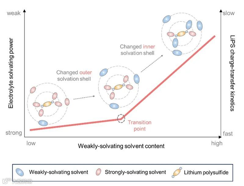 图1. 溶剂化能力与LiPSs电荷转移动力学随着弱溶剂比例提高呈现双阶段行为。
