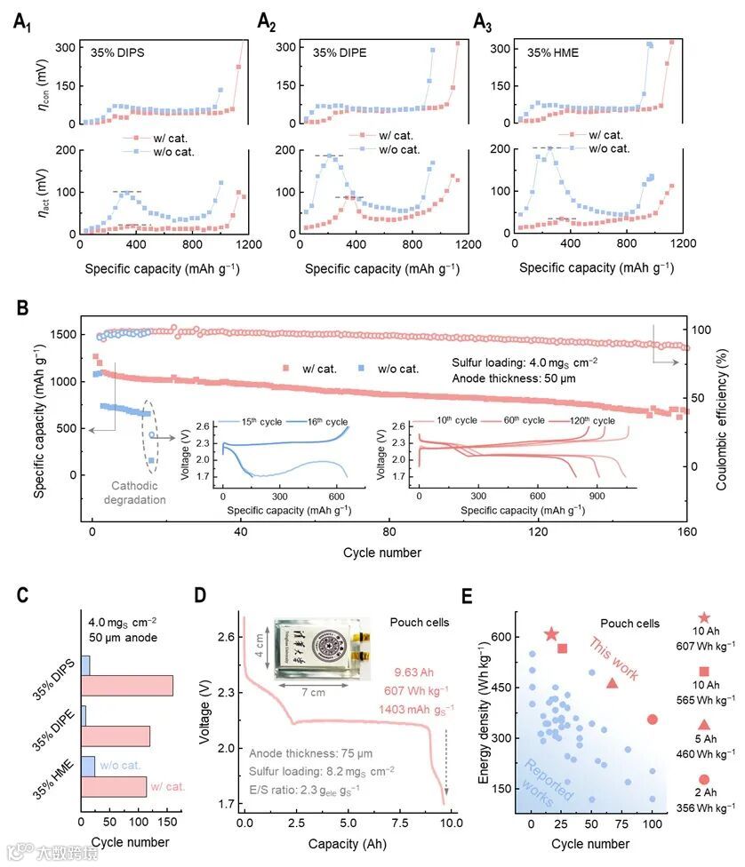 基于上述分析,降低电解液溶剂化能力可以减少负极副反应从而提高循环稳定性,但面临着正极侧动力学迟滞从而降低能量密度的问题。因此,本工作提出了在弱溶剂化电解液中引入催化界面从而优化LiPSs电荷转移动力学的方案(如图7所示)。极化解耦结果表明,引入催化剂后正极侧浓差极化差异较小但电化学极化降低显著,证明了催化剂在加速LiPSs电荷转移动力学方面的有效性。此外,催化剂的引入可以减缓长循环测试下的正极动力学迟滞导致的电池失效,避免了因正极极化过大导致的循环提前终止。整合弱溶剂化电解液和催化剂组合在长循环高比能方面的优势,本工作在10 Ah软包电池尺度实现了607 Wh kg−1的能量密度和17圈的稳定循环,在5 Ah软包电池尺度实现了460 Wh kg−1的能量密度和67圈的稳定循环,在2 Ah软包电池尺度实现了356 Wh kg−1的能量密度和100圈的稳定循环(能量密度均基于软包全部组件质量,包括外壳和极耳),上述性能在领域内处于领先水平。
