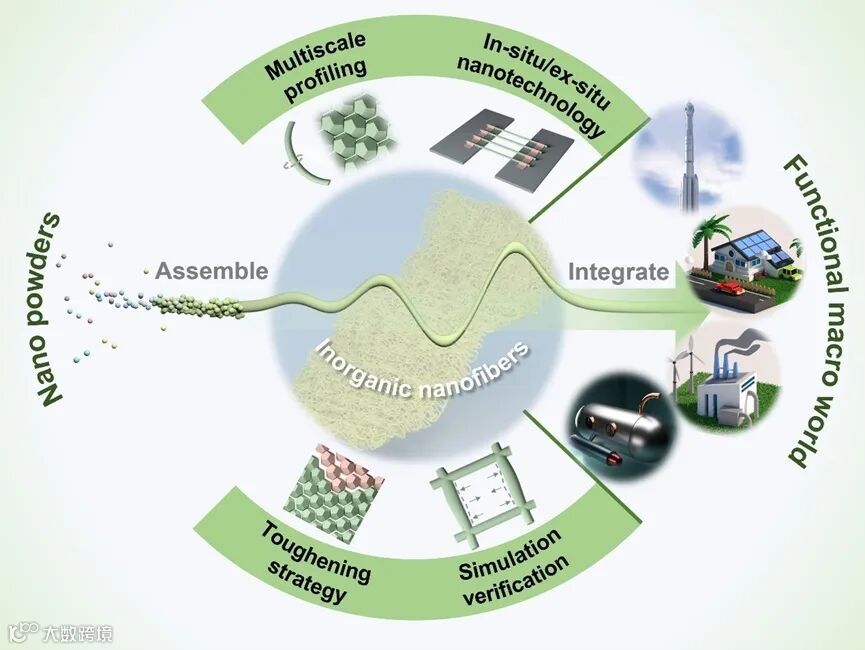 无机纳米纤维作为桥接功能元件与未来系统的理想介质,承载着构建颠覆性功能材料体系的愿景,但其机械脆性严重制约该愿景的实现。因此,亟需从根源重构纳米纤维力学性能以释放其应用潜能。近日,东南大学代云茜教授/吉林大学卢晓峰教授在ACS Nano 上发表综述性论文,深入讨论无机纳米纤维在微观-介观-宏观多尺度下的脆性断裂机制和增韧增强策略,提出融合仿真驱动的结构设计与先进原位表征技术的创新方法,实现实际应力-应变过程的实时监测与机理反演。进一步聚焦氧化物纳米纤维工程化面临的挑战与新兴解决方案,为开发力学强韧、功能稳定的柔性系统提供见解。最终探讨无机纳米纤维突破纳米粉体材料性能瓶颈、实现规模化应用的技术路径,丰富其在能源转化、智能传感、柔性电子等领域的应用前景。