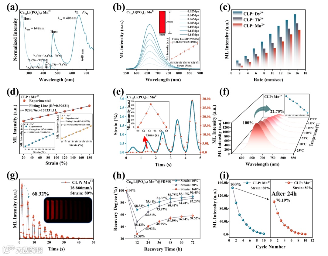 图1. 基于Ca10Li(PO4)7:Mn2+@PDMS的PL/PLE光谱、应力应变ML响应、随温度变化特征及多次拉伸后自恢复性能与可循环性测试,展现了该复合材料在力学传感中的应用潜力。