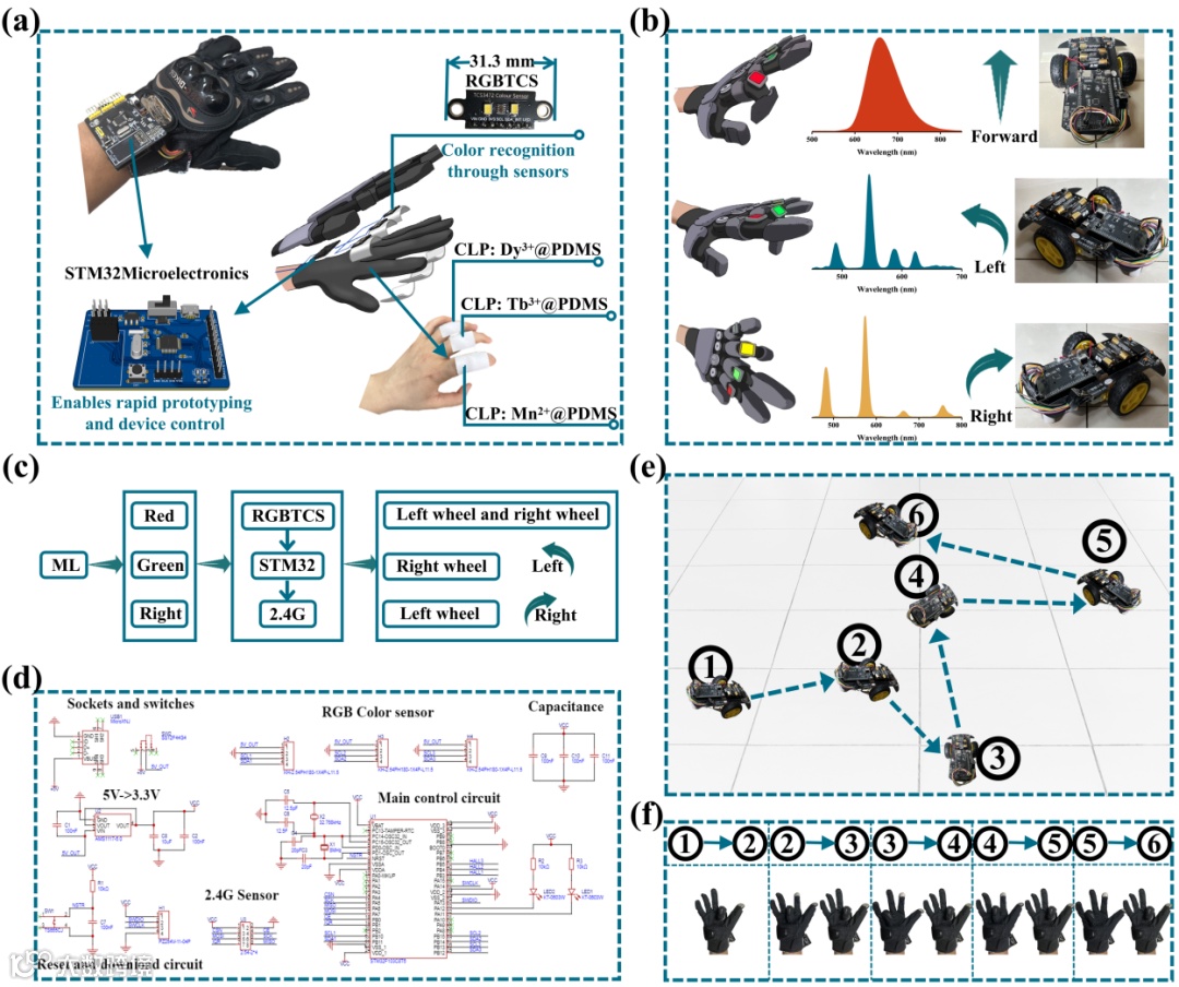 图2. OSWD将ML光学传感手套作为人机交互遥控端,利用RGBTCS传感器和微控电路识别、传输ML信号。不同手指弯曲刺激内部复合材料产生对应ML,从而精准无线控制小车移动。
