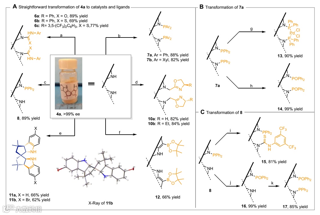 3. 吲哚N1的弱酸性赋予SPINDOLE更大的修饰潜力。很多官能团可以经济高效的一步引入,从而进一步开发成一系列手性催化剂和配体。目前的已证明可行的就有10余个。