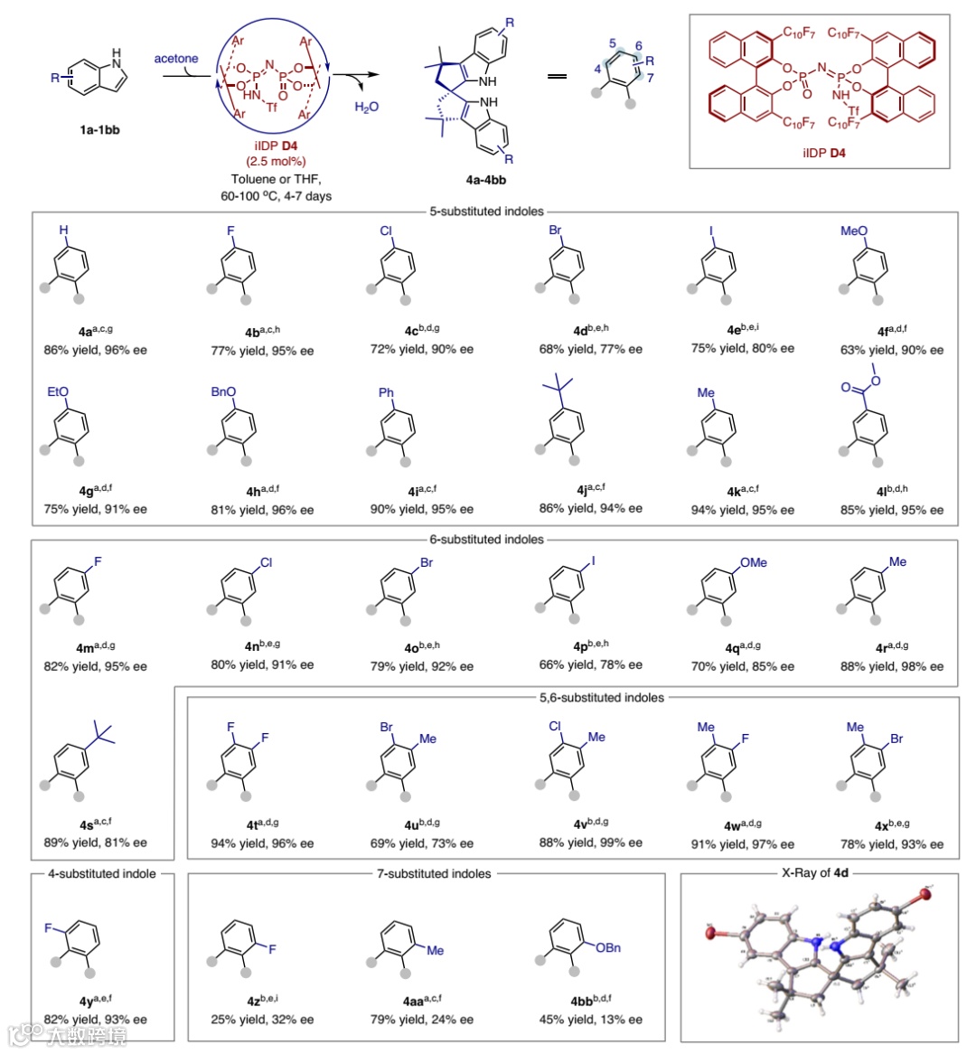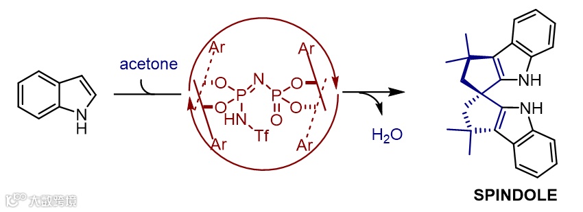 考虑到酚在Friedel-Crafts 烷基化反应中的固有缺陷,本文作者提出将骨架中的酚替换为吲哚能有效克服SPINOL合成中的位置选择性与活性差的问题。通过对一系列不同的催化剂进行筛选发现,具有C10F7特殊取代基的大位阻布朗斯特酸催化剂iIDP在该反应中表现优异,能以极高的收率(94% yield)和对映选择性(96%ee)获得目标产物SPINDOLE。