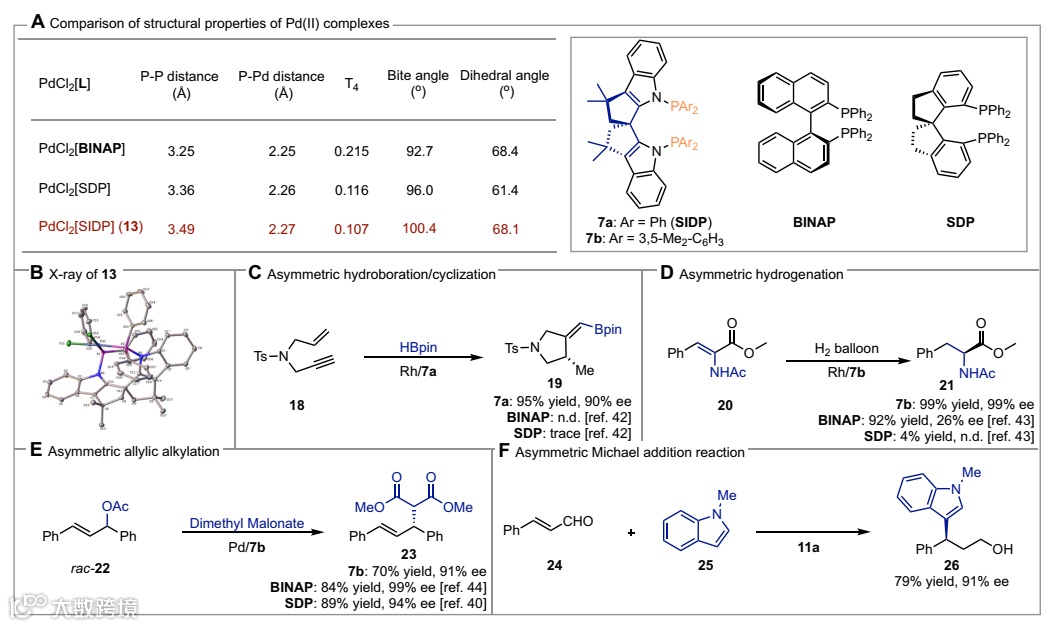 4. 性能独特性。通过分析比较类似物SDP和BINAP的钯配合物的相关参数,研究者发现它们在参数上有很大区别。这也表明它们在催化性能上将有别于BINOL和SPINOL系列的催化剂和配体,在不对称催化领域形成互补。催化应用研究结果同样证明了这一点,SPINDOLE衍生的催化剂和配体在数个不对称催化反应(包括过渡金属催化和有机催化)中表现出优于BINOL和SPINOL骨架配体和催化剂的特性。而其衍生的二胺作为有机催化剂在加成反应中表现优异。表明SPINDOLE衍生物未来在不对称催化等领域具有重大潜力。