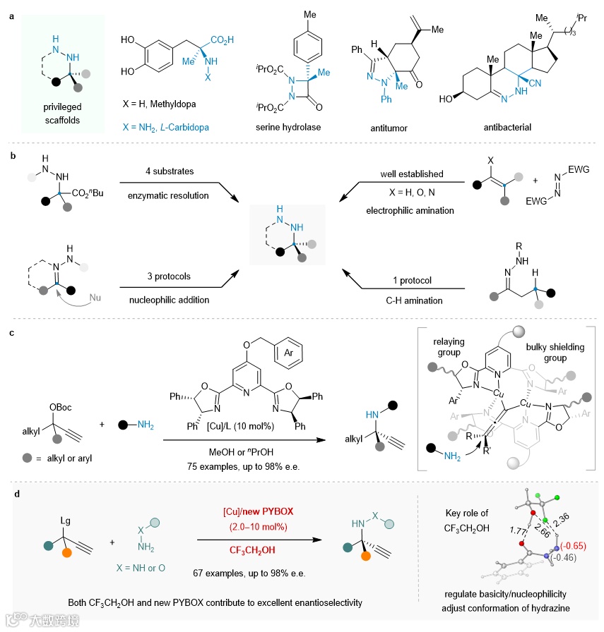 周剑和周锋团队长期致力于吡啶C4位含大位阻功能基的新型吡啶双噁唑啉(PYBOX)的发展及其在挑战性不对称催化反应中的应用研究(Angew. Chem. Int. Ed. 2023, 62, e202301470; Angew. Chem. Int. Ed. 2021, 60, 8488; Chem. Sci. 2020, 11, 97; Org. Lett. 2020, 22, 1270; ACS Catal. 2017, 7, 8588)。前期发展了兼具吡啶C4位大位阻烷氧基和噁唑啉C5位手性传导基的空间受限PYBOX配体,通过两者协同作用增强远程手性控制,成功实现了高底物普适性和高对映选择性的简单酮衍生手性炔丙醇酯的不对称炔丙基胺化反应(Nat. Chem. 2024, 16, 521),构建了一系列手性α-季碳炔丙胺及衍生物。最近,他们进一步发展了吡啶C4位具有大位阻苄硫基的手性传导型PYBOX配体,以增强远程手性控制;同时结合三氟乙醇与肼类化合物之间的多重氢键作用调控肼的碱性/亲核性,抑制N-N键旋转及消除等副反应,成功实现了简单芳基和烷基酮衍生炔丙醇酯的不对称不对称炔丙基肼化反应(图2)。