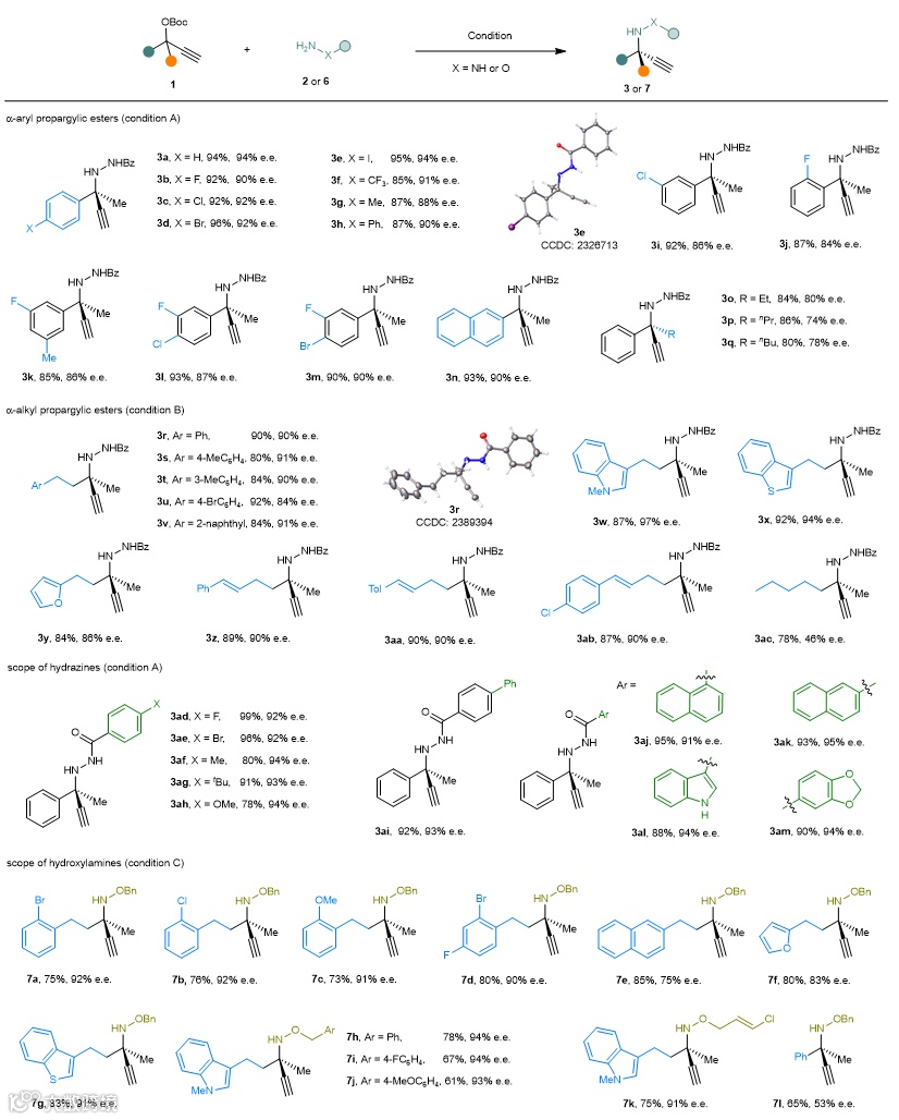 该催化体系展现出优秀的底物适应性:芳基-烷基酮或双烷基酮衍生的炔丙醇酯均可高效转化为α-季碳炔丙基肼,取得优秀的产率和对映选择性。此外,不同电子和位阻效应的芳香酰肼类亲核试剂均表现出良好的兼容性。值得注意的是,该策略可拓展至羟胺衍生物,成功合成了多种直链型α-季碳炔丙基羟胺化合物,解决了传统方法难以构建此类化合物的合成难题(图3)。