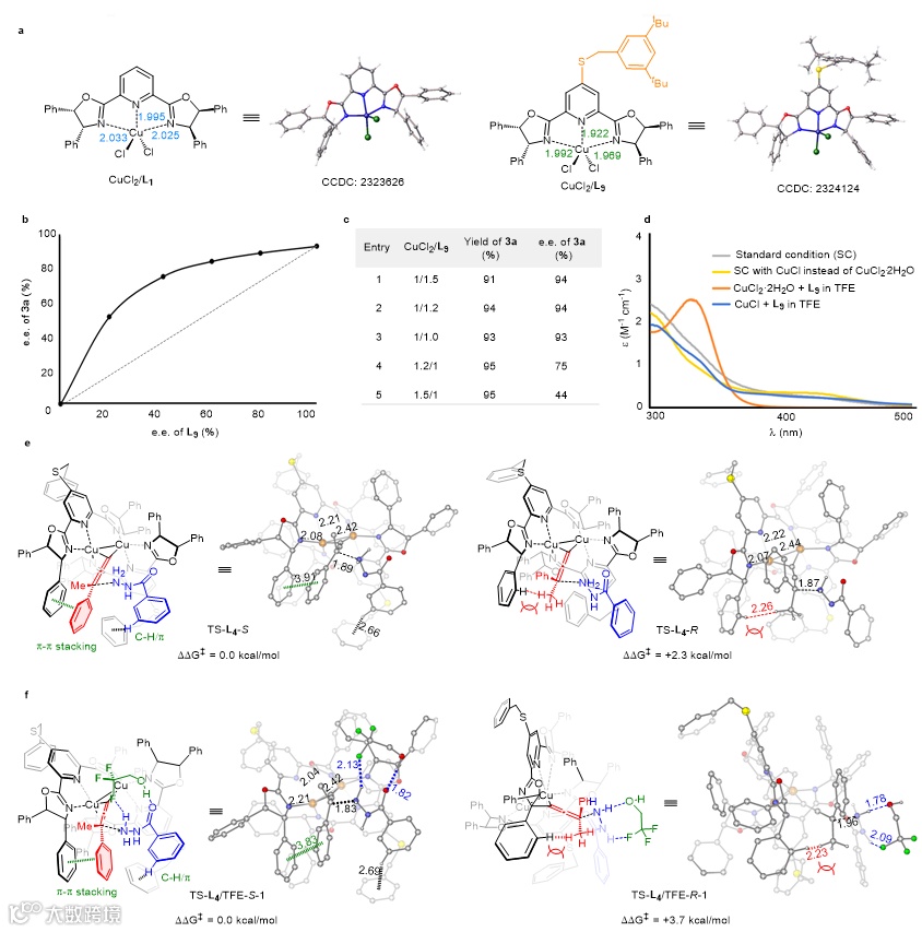 为深入了解反应机制,研究团队与四川大学王欣教授合作开展了系统的理论计算研究。X射线单晶衍射分析与DFT计算表明:PYBOX配体C4位的苄硫基取代显著增强了配体的Lewis碱性,使得Cu-N键长缩短,从而提升催化剂的远程手性控制能力。DFT计算进一步揭示,三氟乙醇与酰肼之间存在C–F···H–N等多重氢键作用,有利于稳定反应优势过渡态中的π-π堆积和C-H/π相互作用,同时加剧不利过渡态中的空间排斥,双重作用协同提高了反应的对映选择性控制(图6)。