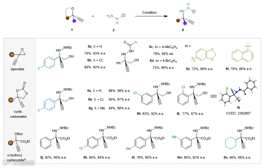 此外,α-季碳乙炔基环氧化合物、环碳酸酯等类型底物,该催化体系下同样可顺利转化为相应手性α-季碳炔丙基肼衍生物,进一步证实了方法的广泛适用性(图4)。