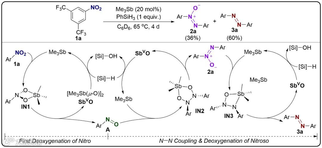 Sb可以还原硝基芳烃生成氧化偶氮芳烃和偶氮芳烃,自身被氧化;锑氧化物可以被硅烷还原再生M