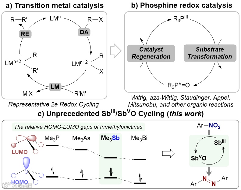 图1. 过渡金属、有机膦催化循环示例及本论文锑催化研究进展。图片来源: