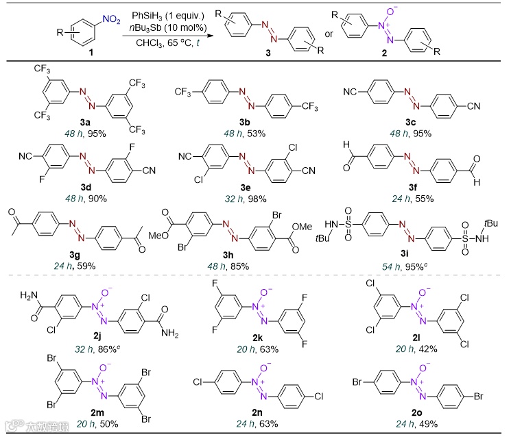 研究表明,其它三烷基锑化合物也能够催化硝基芳烃的还原反应。其中,三丁基锑表现出良好的催化活性,能够以中等到优秀的产率将硝基芳烃转化为偶氮芳烃或氧化偶氮芳烃,反应表现出对硝基还原良好的选择性(图3)。这部分工作展现了