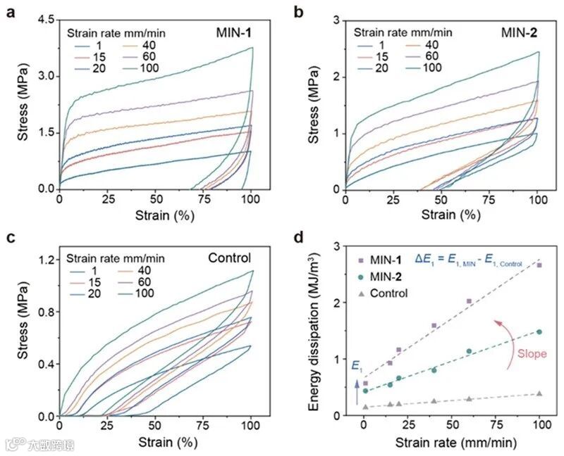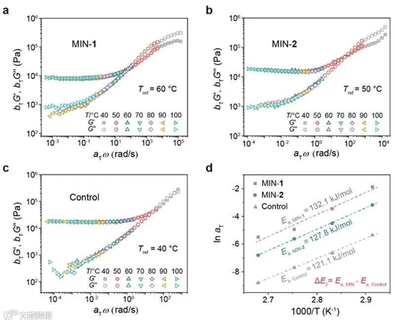 机械互锁聚合物是一类以机械键为核心结构单元的聚合物体系。机械键永久的空间结合与高度灵活的构象自由度,共同赋予了机械互锁聚合物独特的机械性能。上海交通大学颜徐州团队开发了一类具有密集机械键骨架的机械互锁网络(Mechanically Interlocked Networks, MINs)。在外力作用下,机械键的分子内运动被激活,网络的力学性能通过微观机械运动的集成放大得以实现。因此,机械互锁网络的宏观力学行为与机械键的微观动力学紧密相关。此类具有密集机械键骨架的MINs不仅为深化理解机械键运动提供了坚实的研究平台,还对实现机械互锁聚合物的功能化应用具有重要指导意义。其中的核心挑战在于探索影响MIN体系性能的关键因素,并挖掘其在开发高性能材料中的应用潜力。 就这类机械互锁网络而言,致密的结构能够显著放大机械互锁单元的动态性,使得机械键的分子内运动直接影响网络宏观性能。机械键的运动性对材料性能的影响主要体现在两方面:1)在尺度变化上,机械键运动能够释放隐藏链至网络中,这类微观运动的协同作用会使整个网络承受更大的应变;2)在能量变化上,主客体识别的解离及随后的滑动提供了连续的能量耗散机制,显著提升了材料的韧性。因此,有效调控机械键运动的动力学行为对MIN的性能优化至关重要。 近日,颜徐州课题组利用运动性可控的机械键模型,分别从主客体识别和随后的滑动两个方面,建立了调控能量耗散的强化策略,并提升了材料的能量耗散能力和韧性(图1a和1b)。该工作加深了对机械互锁材料能量耗散机制的理解,并将为高性能机械互锁材料的开发提供重要的见解和有价值的指导。相关工作发表在近期的Journal of the American Chemical Society 上。该工作以具有密集机械键骨架的MIN为模型,其中MIN-1和MIN-2均具有相同二级铵盐轴的[2]轮烷结构组成。两者的唯一区别在于冠醚大环的尺寸:MIN-1采用较小的苯并-21-冠-7(B21C7),而MIN-2则采用较大的苯并-24-冠-8(B24C8)(图1c)。通过应变速率依赖的循环拉伸实验值外推得到了MIN-1和MIN-2中驱使机械键运动所需的能量,这反映了冠醚尺寸减小有利于增强主客体识别。同时,利用Arrhenius方程拟合主曲线高温区的水平移动因子aT,获得了MIN-1中与机械键滑动运动相关的表观活化能高于MIN-2,表明在主客识别解离后,尺寸小的B21C7环沿轴滑动过程需要克服更大的摩擦。这两个因素均说明更小尺寸冠醚环的MIN-1拥有更优越的能量耗散能力。图1.(a)[2]轮烷微观机械运动的连续能量耗散机制;(b)[2]轮烷中冠醚环尺寸对主客体识别的解离和随后滑动运动的影响;(c)具有密集[2]轮烷骨架的MIN-1和MIN-2的形成示意图。 首先,通过光诱导的硫醇-烯烃点击化学分别构筑了仅冠醚环尺寸不同的机械互锁网络MIN-1和MIN-2,并对其进行基本的结构和性能表征。随后,为验证减小冠醚尺寸可提高轮烷能量耗散能力的设计理念,在消除玻璃化转变温度差异的测试条件(T = Tg+ 10 °C)下对两种MIN进行了机械性能测试。与基于B24C8的MIN-2相比,基于B21C7的MIN-1拥有更高的阻尼(92% vs 78%),展现出显著更强的能量耗散能力,从而导致了MIN-1更高的韧性(7.50 vs 5.70 MJ/m3)。此外,在MIN-1中,增强的主客体识别作用有助于提高其屈服应力(5.90 vs 4.60 MPa)和杨氏模量(25.0 vs 18.5 MPa),而更大的滑动摩擦则减小了机械键的滑动距离,从而轻微损失了MIN-1的断裂伸长率(238% vs 248%)(图2a−e)。CoGEF理论计算表明,相较于基于B24C8的[2]轮烷,基于B21C7的[2]轮烷在主客体识别解离和随后的滑动运动均需要更高的能量(图2f和2g)。图2.(a−e)在相同测试条件下,MIN-1和MIN-2的机械性能比较;(f, g)机械互锁网络中[2]轮烷1和[2]轮烷2的CoGEF理论模拟及相应的滑动行为示意图。 作者进一步通过不同应变速率下的循环拉伸试验评价了机械互锁网络的能量耗散行为。作者采用相同的投料比制备了一个不能沿轴滑动的共价聚合物网络以排除MIN中共价链段对弹性网络的影响。为了更加直观地评估[2]轮烷单元启动滑动所需要的能量,作者提取应变速率与能量耗散的值并进行线性拟合,并将MIN-1、MIN-2和对照拟合结果外推到0 mm/min时,得到能量耗散值分别为660、410和150 kJ/m3(图3)。此时,MIN中的[2]轮烷单元处于主客体识别解离的准静态。因此,通过消除MIN中共价交联网络链段运动的影响之后,可以得到MIN中整合的[2]轮烷单元从静态结合到动态滑动这一转变所需的能量∆E1,这与能量耗散机制中第一步(主客识别解离)所需的能量直接关联。其中,MIN-1和MIN-2的∆E1值分别为510和260 kJ/m3,表明MIN-1中的B21C7轮在轴上启动滑动比MIN-2中B24C8轮需要克服更大的能量。图3. 当施加的预应变为100%时,(a)MIN-1、(b)MIN-2和(c)对照在不同拉伸速率下的循环拉伸曲线;(d)根据三者的能量耗散与应变速率关系拟合的曲线。 此外,作者利用主曲线研究了MIN在不同时间尺度下的动态行为,并根据Arrhenius方程拟合了三者水平因子与温度的线性关系曲线。根据以往的报道,主客体识别的解离发生在60 ℃左右。高于这一温度,MIN-1和MIN-2的表观活化能主要由[2]轮烷单元的滑动运动和链段运动共同影响,而对照的表观活化能仅受后者的影响。因此,排除后者的影响后可以得到MIN-1和MIN-2中[2]轮烷单元在滑动过程中所需能量∆E2,即能量耗散的第二步—轮沿轴滑动所需能量。计算得到MIN-1和MIN-2的∆E2值分别为11.0和6.70 kJ/mol(图4)。因此,MIN-1中B21C7轮在沿轴滑动时需