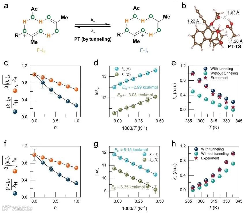 1反应的同位素实验以及温度依赖性实验的结果分析,两种中间体之间的转化是由乙酸构筑的氢键导线介导的协同质子隧穿转移(PT)过程。