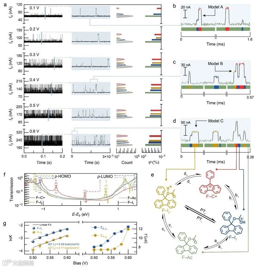 ,通过对外电场的精准控制,研究人员成功的在单分子水平上捕获了两种短寿命的质子化中间体,并阐明了它们在溶剂解反应中的作用。此外,