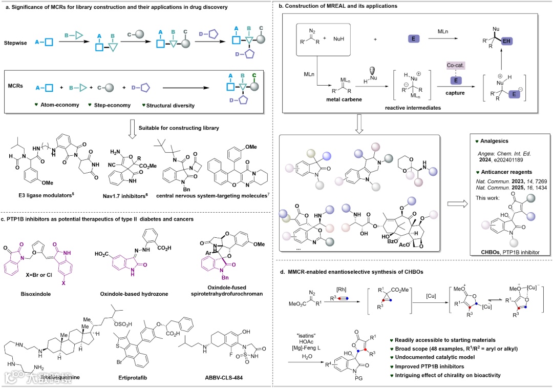 多组分反应(MCR)因高原子、步骤经济性,已成为药物发现中构建“大库”的利器,但实现高选择性一直难以攻克。本工作创新引入铑、铜、布朗斯特酸和镁四元协同催化,实现了四组分(重氮乙酸酯、炔烃、水和靛红)级联反应的优秀的化学选择性和立体选择性,为快速获取多样化手性分子并发现新型生物活性化合物提供了有力工具。